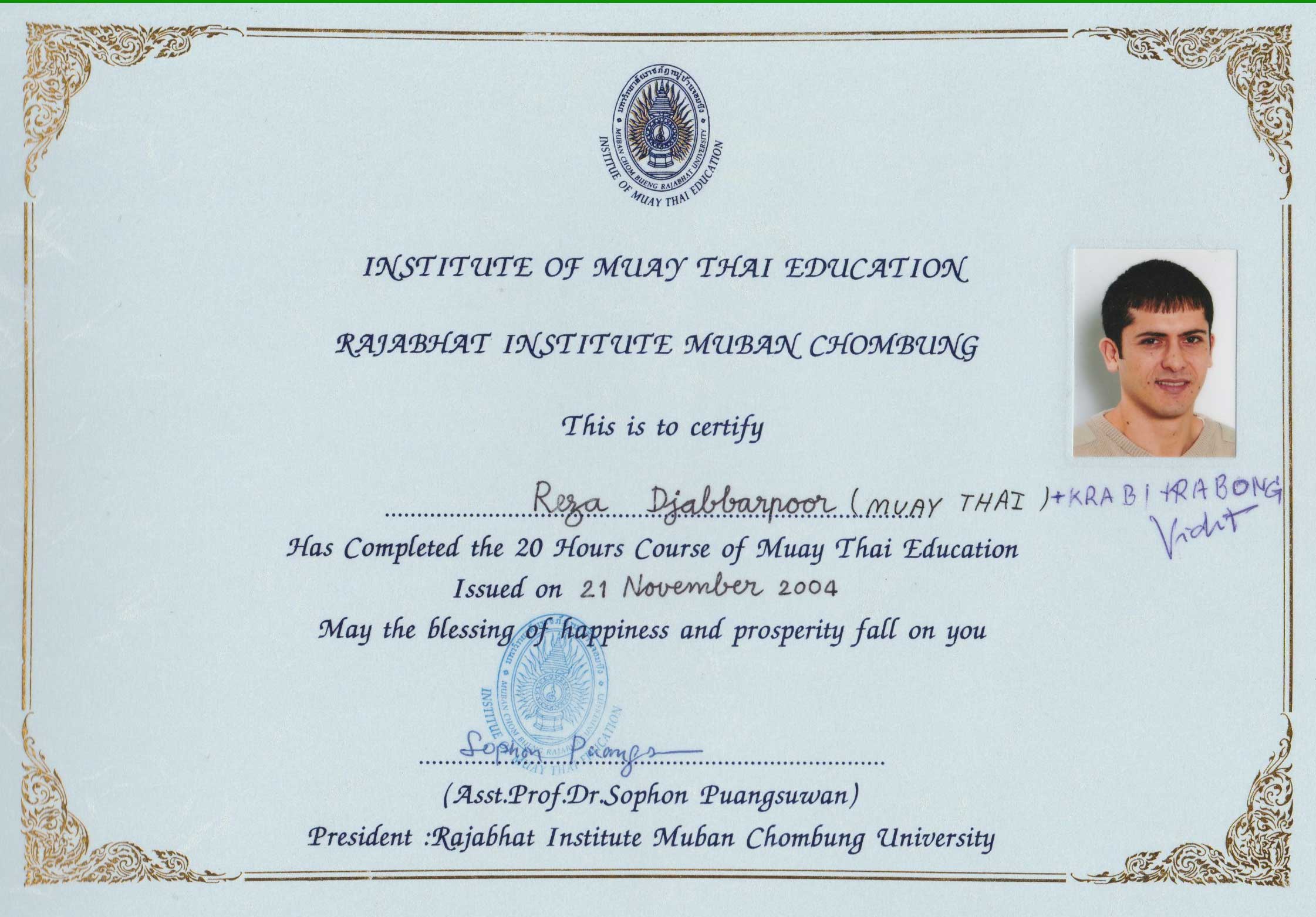 - Trainer: RIP Grand Master Mohammad Agha Towhidi / Grand Master Dr. Pho / Senior Grand Master Dr. Vichit (höchsten Meistergrad im Krabikrabong weltweit)